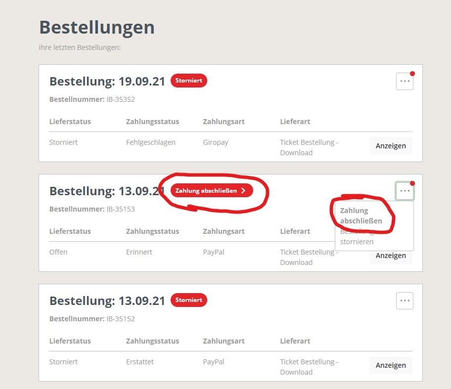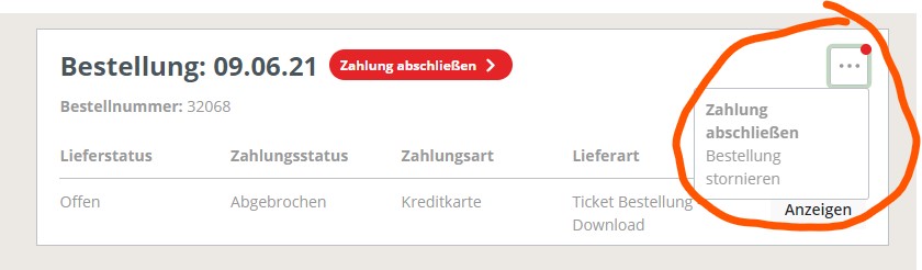 Ist die Bestellung bisher noch nicht bezahlt, geben wir Euch nun die Chance eine Bestellung auch nachträglich noch zu bezahlen. Im Menüknopf rechts in der Bestellung habt Ihr nun die Möglichkeit den Zahlungsvorgang erneut anzustoßen über den Menüpunkt "Zahlung abschließen".